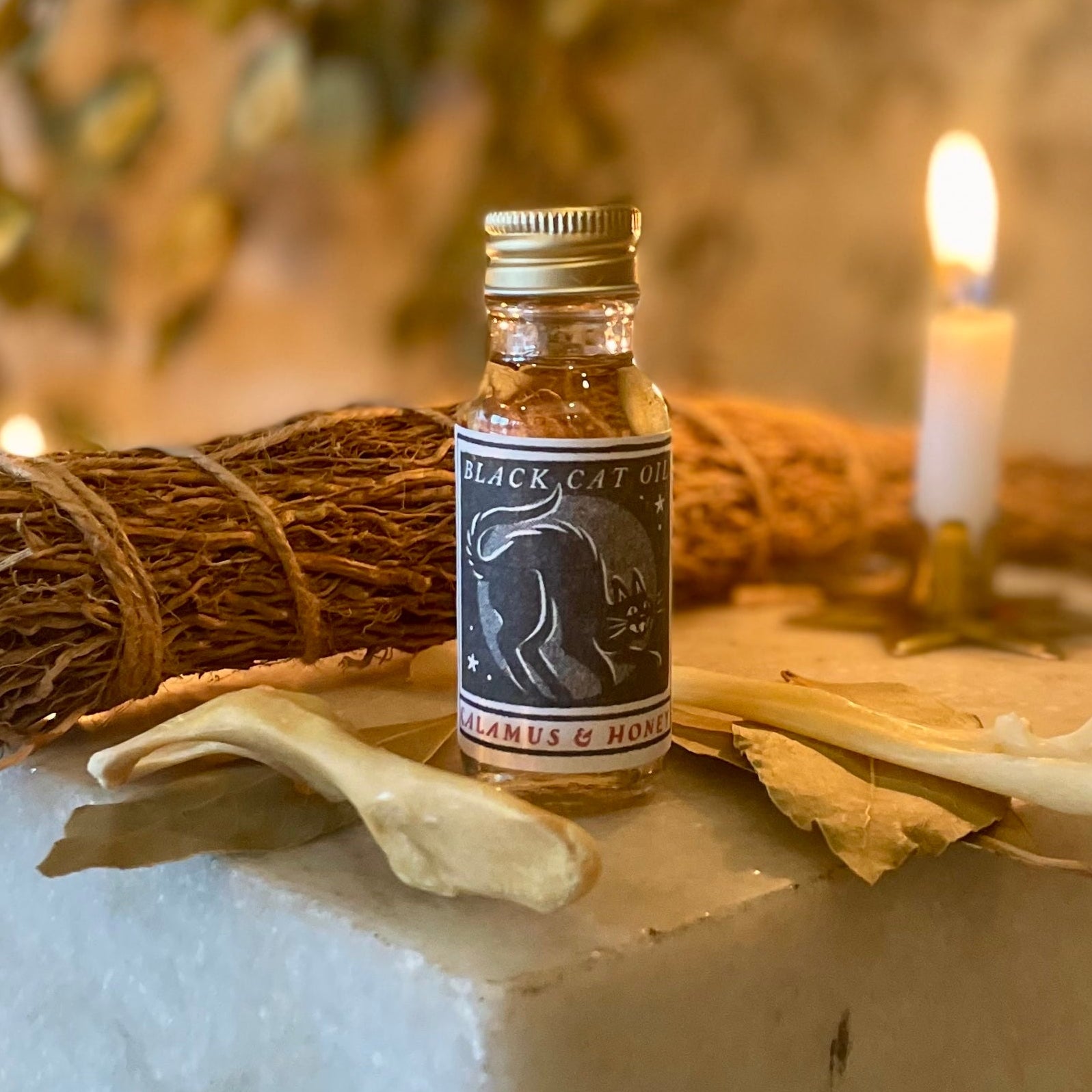 Made with genuine black cat bone, black cat hair, devil's shoestrings, bay, and much more